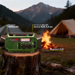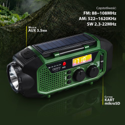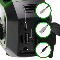Three power sources: solar panel, hand crank dynamo, and USB-C charging for complete energy independence
